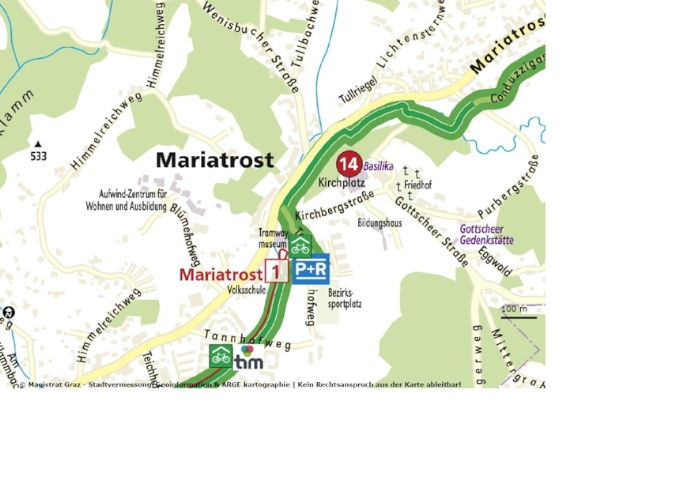 Straßenbahnlinie 1 (ab Hilmteich Buslinie E1) bis Endhaltestelle Mariatrost
