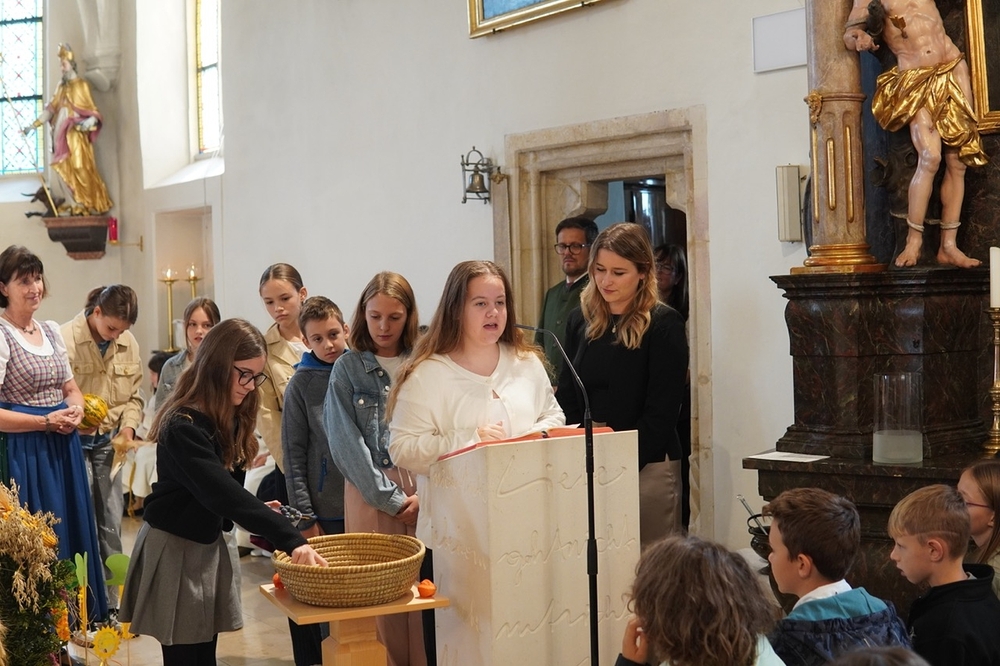 Nach dem feierlichen Einzug fand die Erntedankkrone, dieses liebevoll geschmückte Symbol reicher Ernte, vor dem Altar ihren Ehrenplatz. Danke der Landjugend Zettling für diese schöne Tradition!
