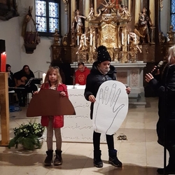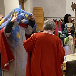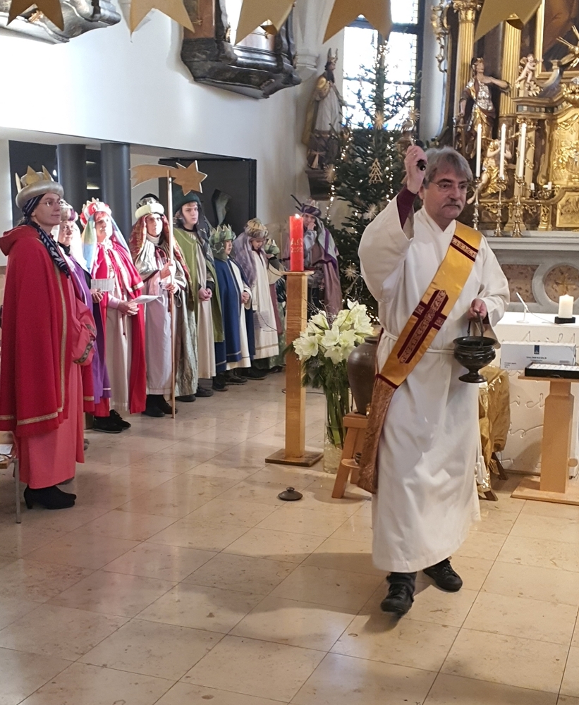 Mit einem königlichen Einzug begann der Sternsingergottesdienst am Dreikönigstag. Diakon Michi Zepf zelebrierte die Wort-Gottes-Feier mit Kommunionspendung zum „Hochfest der Erscheinung des Herrn“. In vielen Texten und Liedern kam das Anliegen der Dreikönigsaktion zum Ausdruck. Noch einmal trat eine Sternsingergruppe auf und präsentierte ihre Botschaft. Die Segnung des Dreikönigswassers und des Salzes, das auch zum Mitnehmen angeboten wurde, bildete zusammen mit der Allerheiligenlitanei, vorgetragen von Martin Kirchberger, den feierlichen Abschluss der WGF.