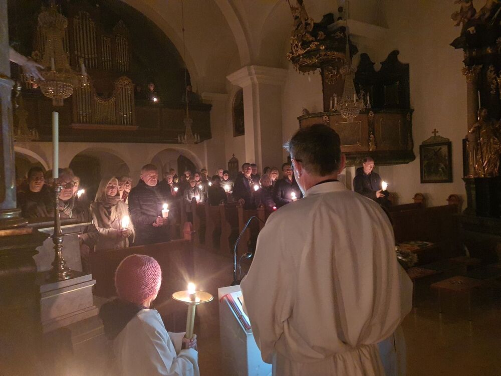 Noch einmal wurden – wie schon am Friedhof – die Namen der Verstorbenen von Allerheiligen 2022 bis Allerheiligen 2023 vorgelesen. 43 Teelichter wurden entzündet, eines davon für alle nicht namentlich genannten Verstorbenen.