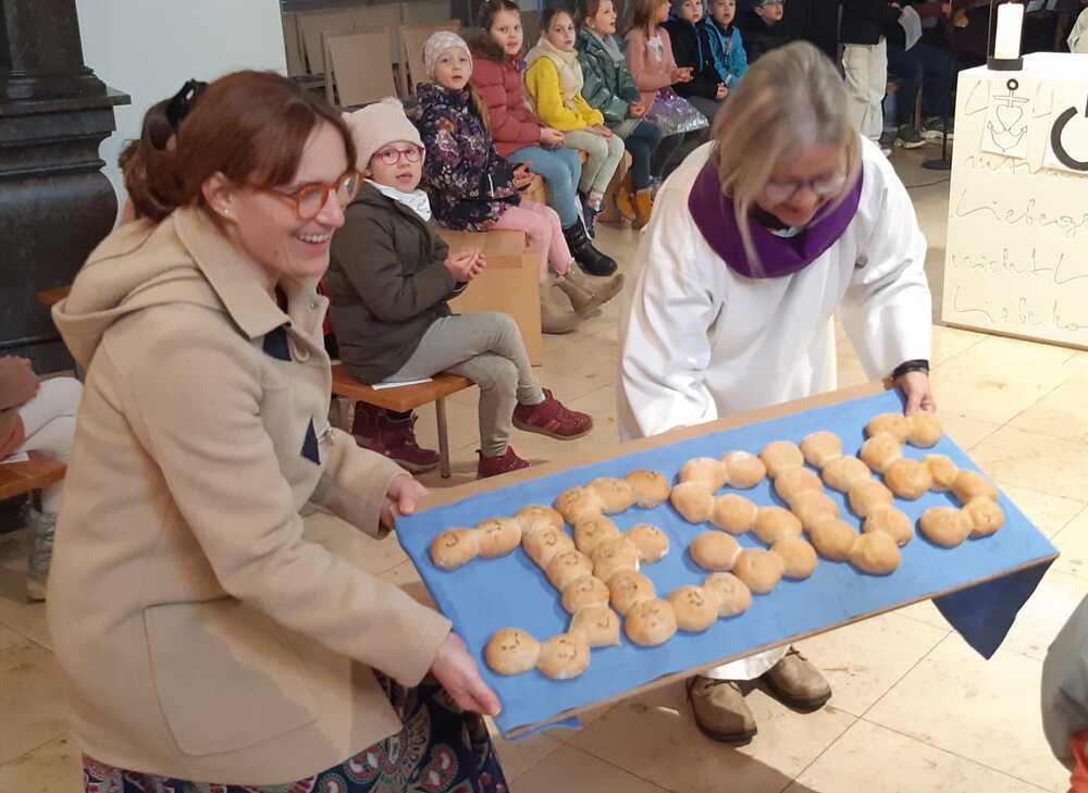 Mit Brot, Herz und den selbstgebastelten Filztaschen zogen wir gemeinsam in die Kirche ein. Das Evangelium vom barmherzigen Vater, der sich von Herzen freut als sein Sohn zu ihm zurückkehrt, begleitete uns durch die Feier. Wir durften Gott als einen erfahren, der ganz anders ist als wir Menschen es uns oft denken. Gott liebt uns, so wie wir sind und freut sich mit uns, wenn wir unsere Fehler erkennen und um Verzeihung bitten. Er ist einer, der nichts nachträgt und der uns immer eine neue Chance gibt.