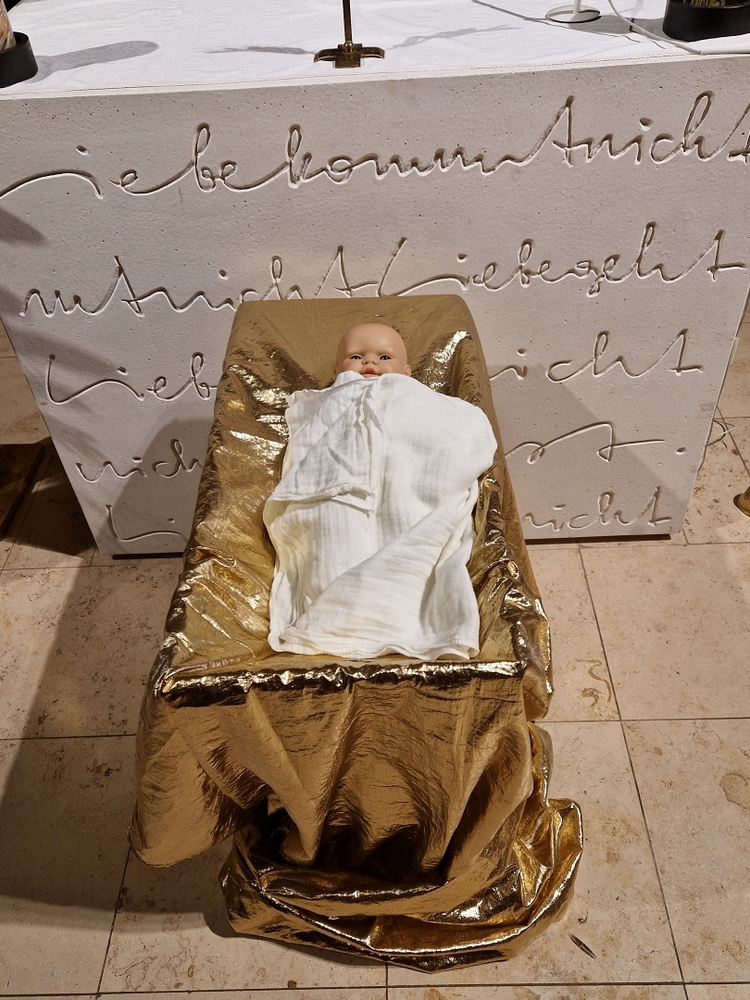 In seiner Predigt sprach Vikar Gerhard von Gott, der als kleines, hilfloses Kind zur Welt gekommen ist, in Armut und Bedürftigkeit. Eine mitgebrachte Windel symbolisiert dies. - Gott ist einer von uns, er kommt uns entgegen. Er ist ein Gott, an den wir uns anlehnen können. Er umarmt uns und stillt unser Verlangen nach Geborgenheit, Liebe und Frieden. …