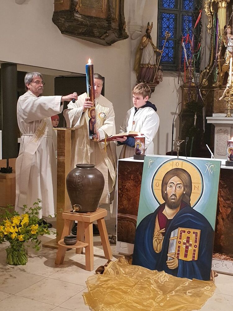 Diese Auferstehungsfreude erlebten wir mit ganzem Herzen am frühen Ostermorgen in unserer Pfarrkirche beim gemeinsamen Feiern. Symbol des auferstandenen Christus ist die Osterkerze, heuer gestaltet von Birgit Zepf. Das Licht dieser Kerze wird uns wieder das ganze Jahr hindurch an diese freudige Botschaft des Ostermorgens erinnern!