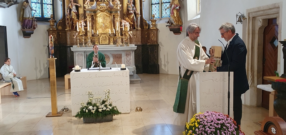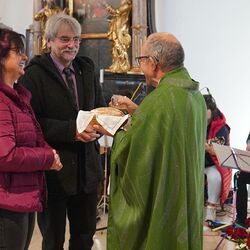 Dazu kamen als Besonderheit dieses Sonntags Glück- und Segenswünsche für unseren Diakon Michi Zepf, der genau an diesem Tag seinen 60. Geburtstag feierte. Ernst Pock, Vorsitzender des PGR, gratulierte herzlich und überreichte ein für Michi „zugeschnitztes“ Geschenk. Dass er den Segen Gottes bis in die Zehenspitzen spüren möge, wünschten ihm schließlich die Sängerinnen und Sänger des Kirchenchores in ihrem Segenslied!