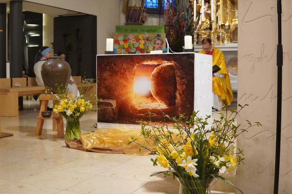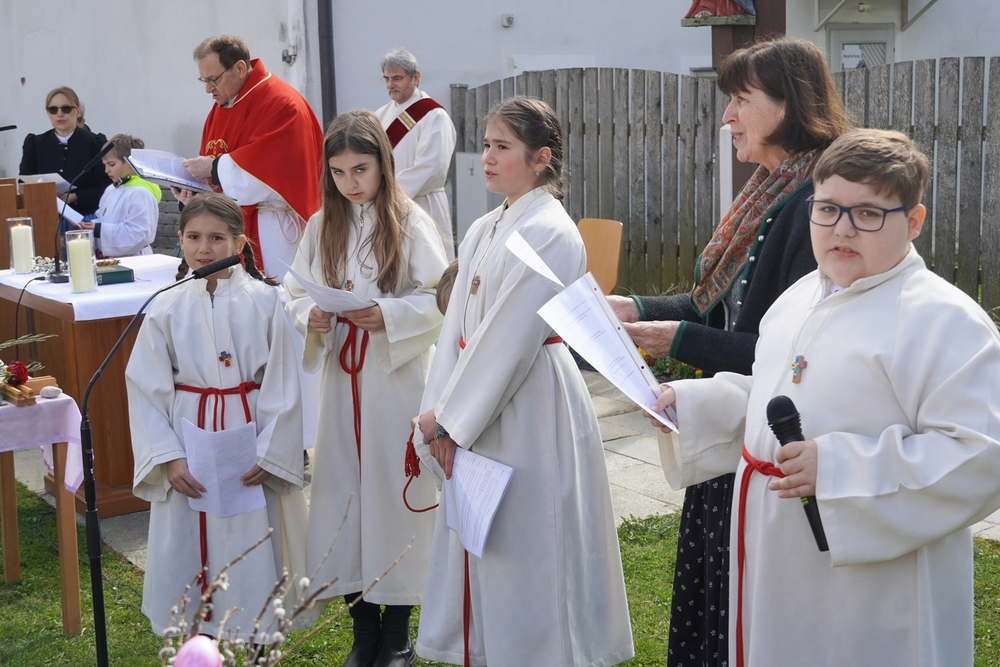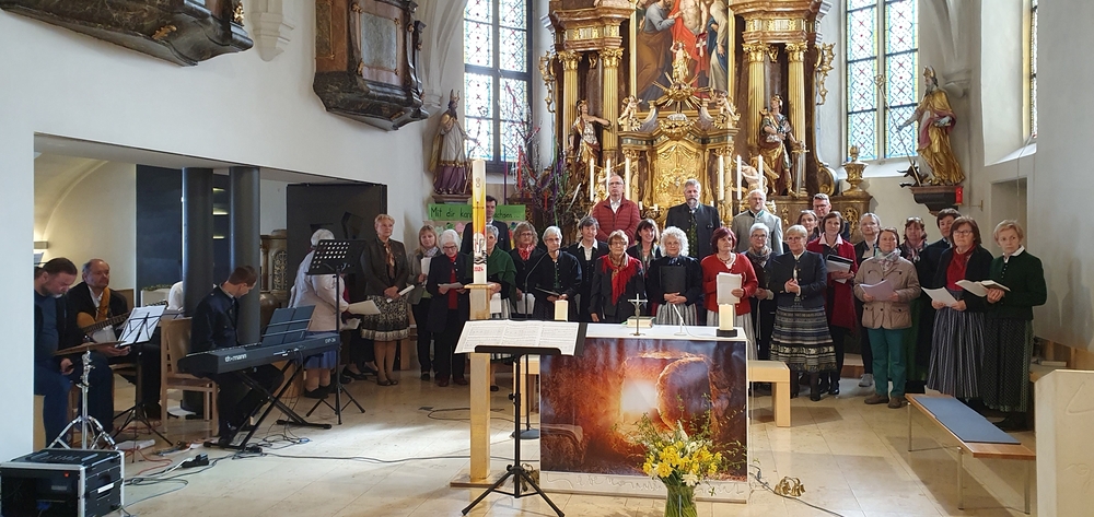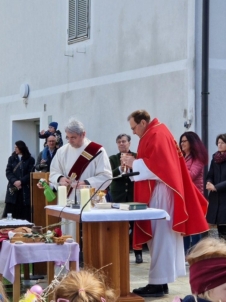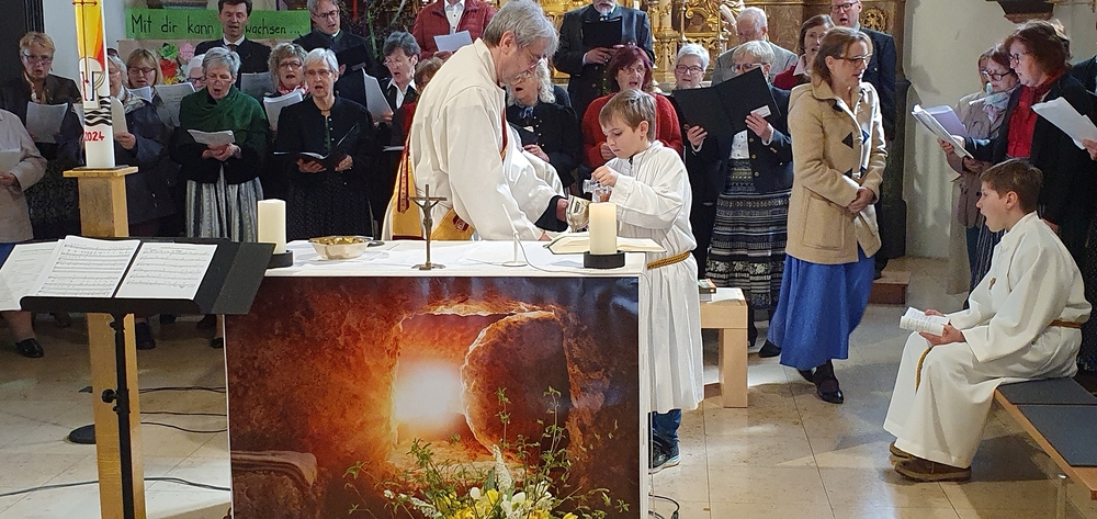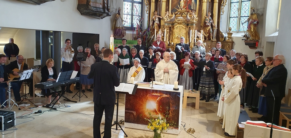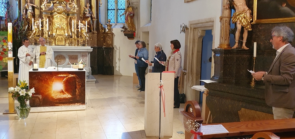 Die Auferstehungsfeier zelebrierten Vikar Gerhard Hatzmann und Diakon Michi Zepf, zusammen mit den Minis, den Lektorinnen und Lektoren, mit Kantor und Kantorin, der Musikgruppe und allen Gläubigen.