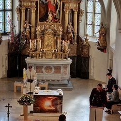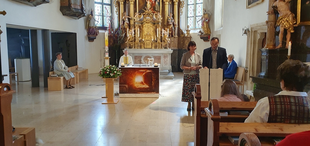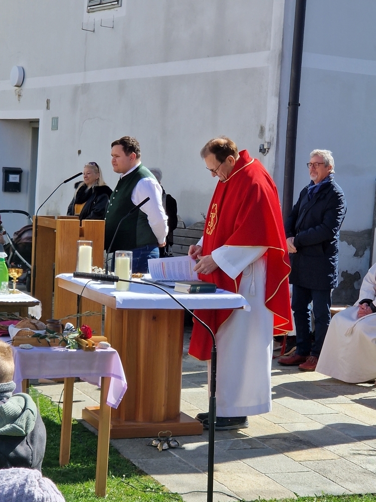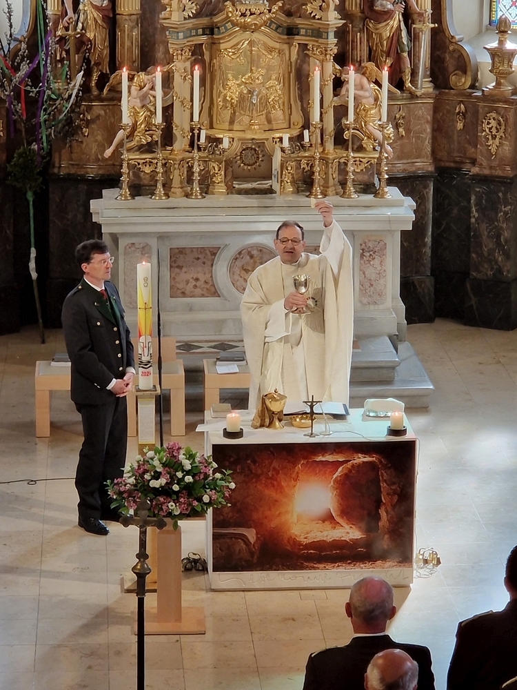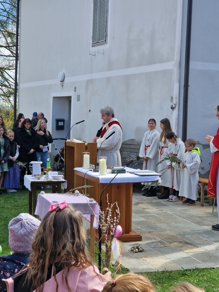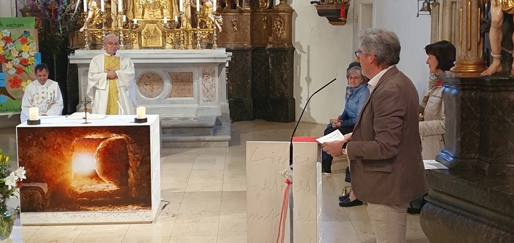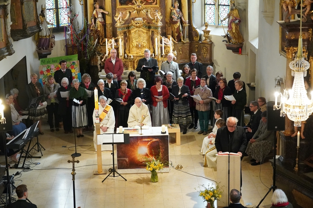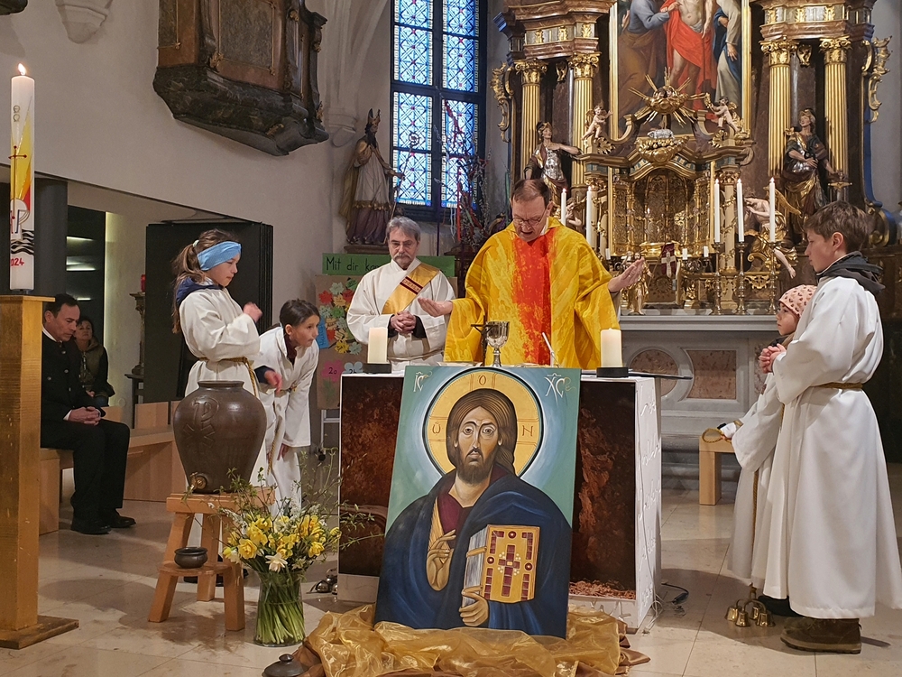 Die Auferstehungsfeier zelebrierten Vikar Gerhard Hatzmann und Diakon Michi Zepf, zusammen mit den Minis, den Lektorinnen und Lektoren, mit Kantor und Kantorin, der Musikgruppe und allen Gläubigen.