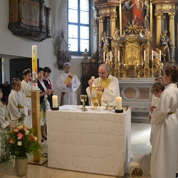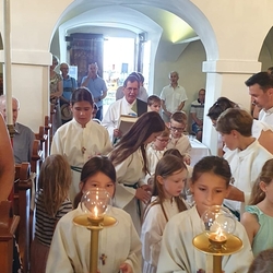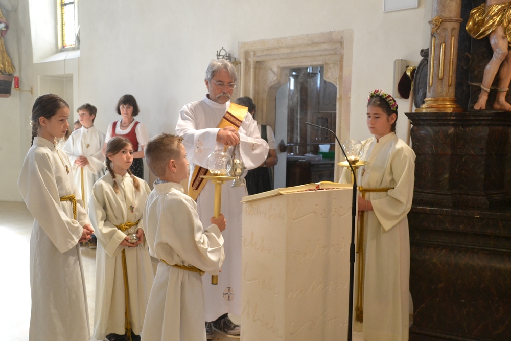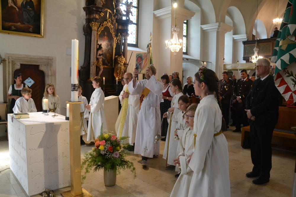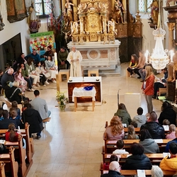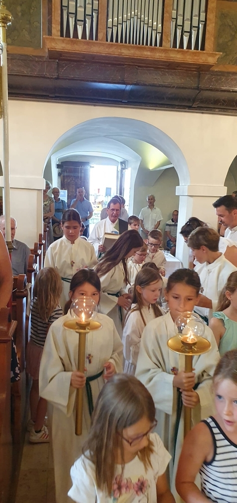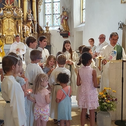 Die Erstkommunionkinder durften gemeinsam mit ihren Taufpaten/Taufpatinnen feierlich in die Kirche einziehen. Die Symbole der heiligen Taufe wurden vorgestellt und anschließend konnten die Patinnen/Paten und die Kinder ihr Taufversprechen sowie das Glaubensbekenntnis erneuern.