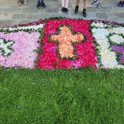 Mit großer Freude und Kreativität legten auch heuer die Minis am Vorabend zu Fronleichnam ein Blumenbild, diesmal sogar ein Tryptichon: Kelch und Brot, ein Kreuz und eine Taube wurden mit viel Eifer zuerst aufgemalt und dann mit den Blüten gestaltet.