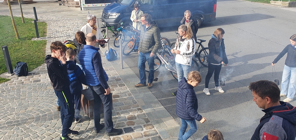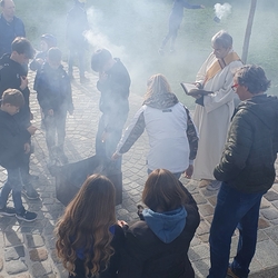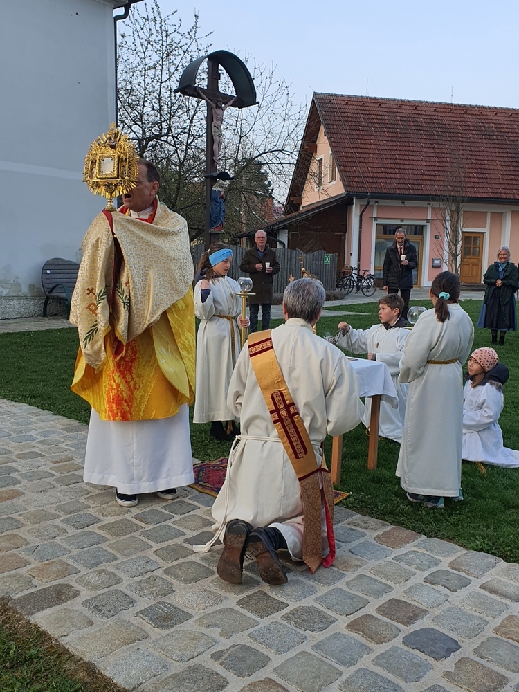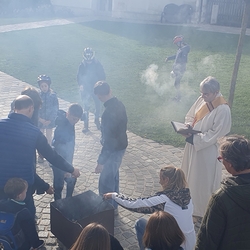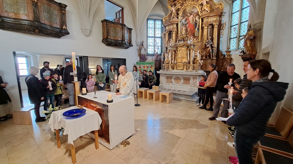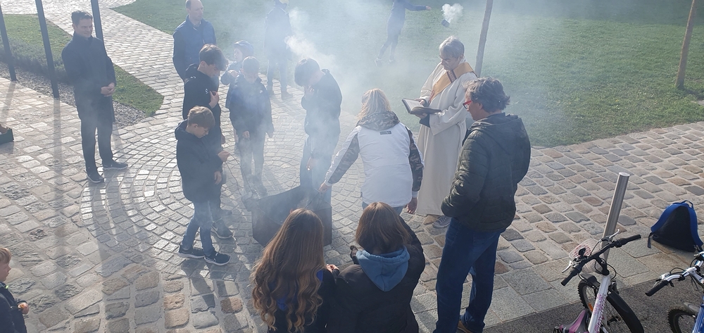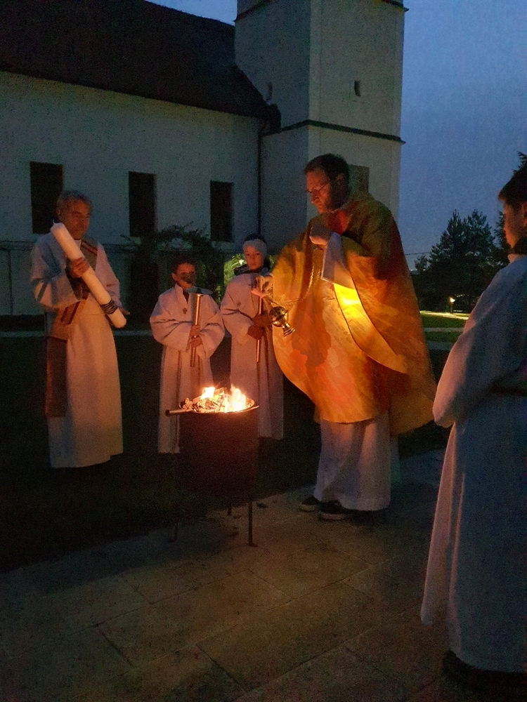 Nach altem Brauch segnete Diakon Michi Zepf am Karsamstag schon frühmorgens das Feuer vor der Kirche, das einige Kinder dann als „Weihfeuer“ in die Häuser und Wohnungen brachten. Es soll die Bewohner*innen vor Unwetter schützen.