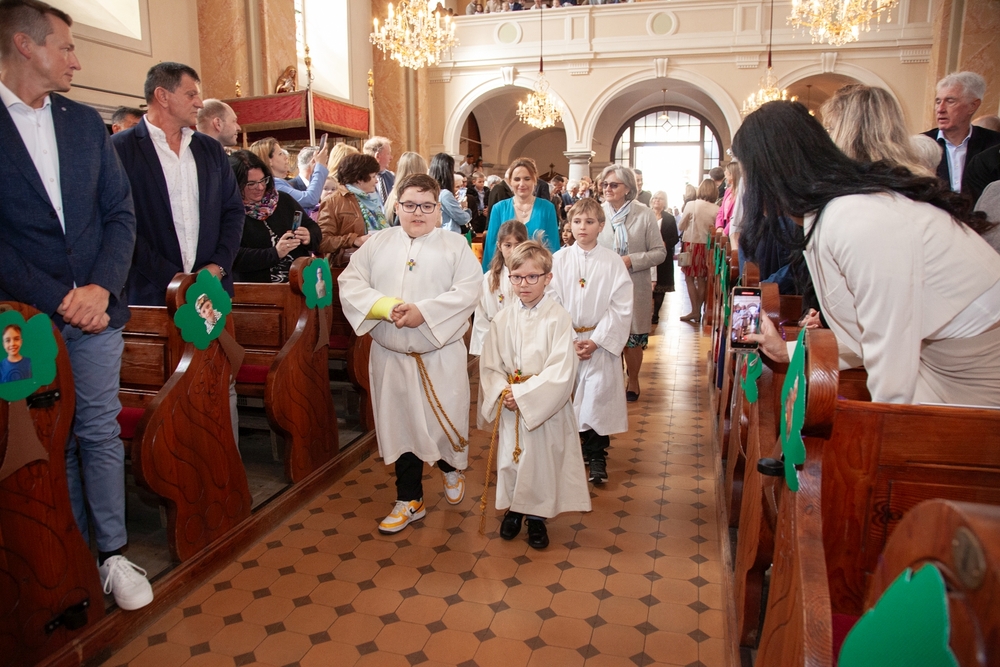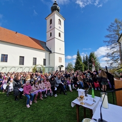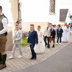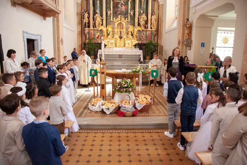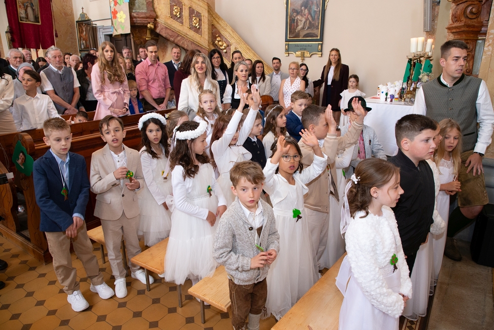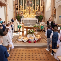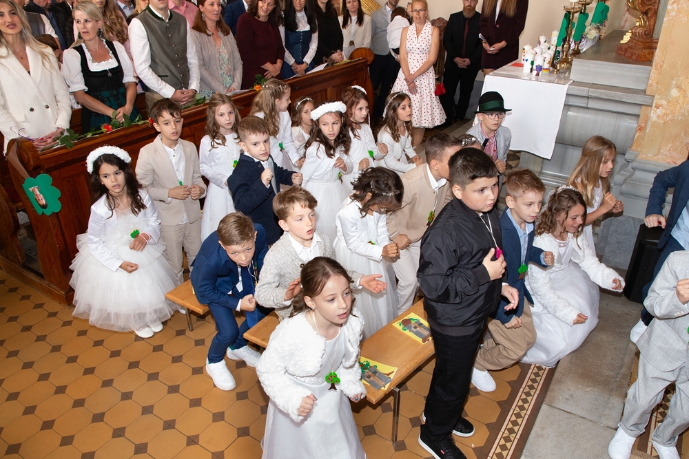 Die Kinder der vier 2. Klassen feierten am Samstag, 4. Mai ihre heilige Erstkommunion aufgrund der schlechten Wetterprognosen in der Pfarrkirche Wundschuh. Erstmals konnten wir mit 52 Kindern und ihren Familien nicht auf unserem Kirchplatz in Premstätten feiern. Bei 13 Grad Celsius zogen die Kinder in die Kirche ein. Doch uns wurde bald wärmer! Nicht nur durch das schöne miteinander Feiern, sondern auch weil so viele Gäste die Kirche bis auf den letzten Platz füllten.