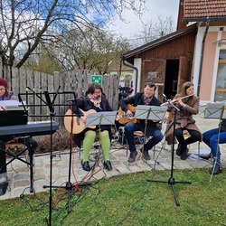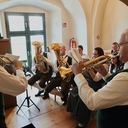 Im Anschluss waren die ehrenamtlichen Mitarbeiterinnen und Mitarbeiter beider Pfarren zum gemütlichen Beisammensein ins Kulturheim Wundschuh geladen. Dort konnte man - bei fröhlicher Musik der Lichtmessgeiger - köstliche Brötchen, Sekt und Krapfen genießen und den Rosenmontag mit angeregten Gesprächen ausklingen lassen.