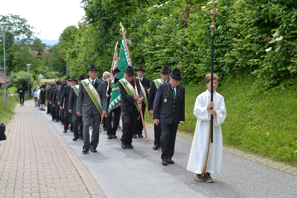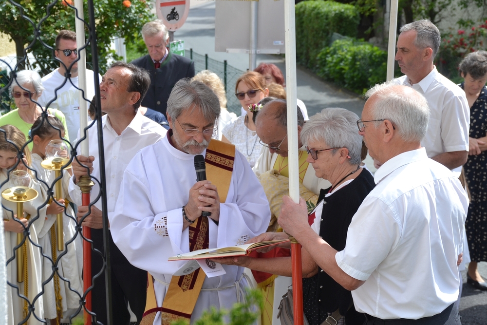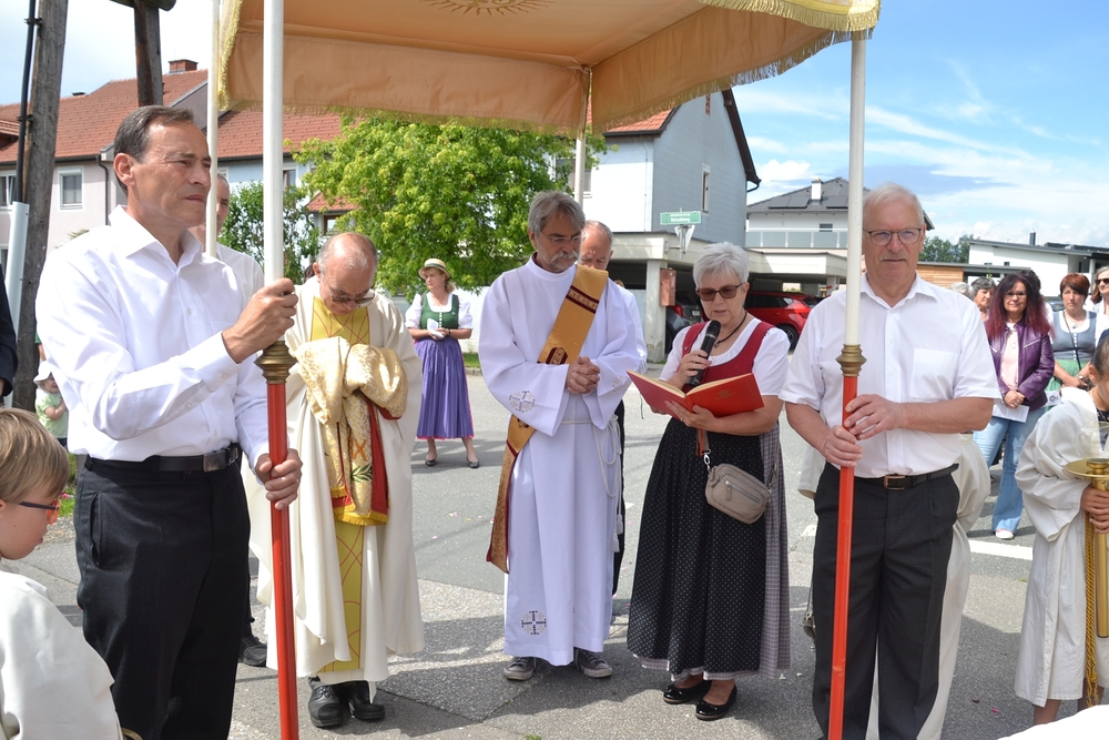 So konnte nach der heiligen Messe mit Vikar Norbert Glaser und Diakon Michi Zepf die Prozession wie geplant ihren Weg nehmen. An den vier Altären, die liebevoll geschmückt waren, wurde das Wort Gottes verkündet und Lobpreis, Dank und Bitte in Gebeten und Liedern ausgedrückt.