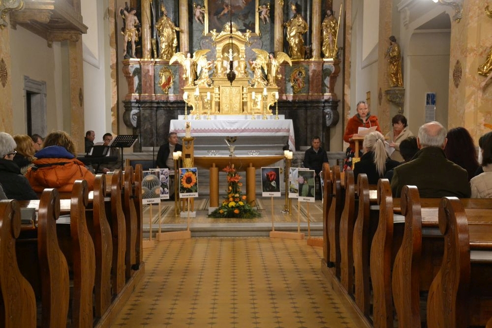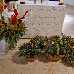 Im Zentrum der schön gestalteten Feier standen ein Taufgedächtnis mit Weihwasserritus, ein Evangelium (Mt, 6, 26-33), Blumentexte (in denen man sich mit der einen oder anderen Blumenbeschreibung ganz gut identifizieren konnte), Dankesworte sowie Fürbitten.