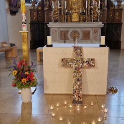 Die Lichter vor dem bunten Kreuz künden von der Wort-Gottes-Feier, die Elisabeth Schöpf am 9. Juni, dem Vatertag, in unserer Kirche gestaltete.