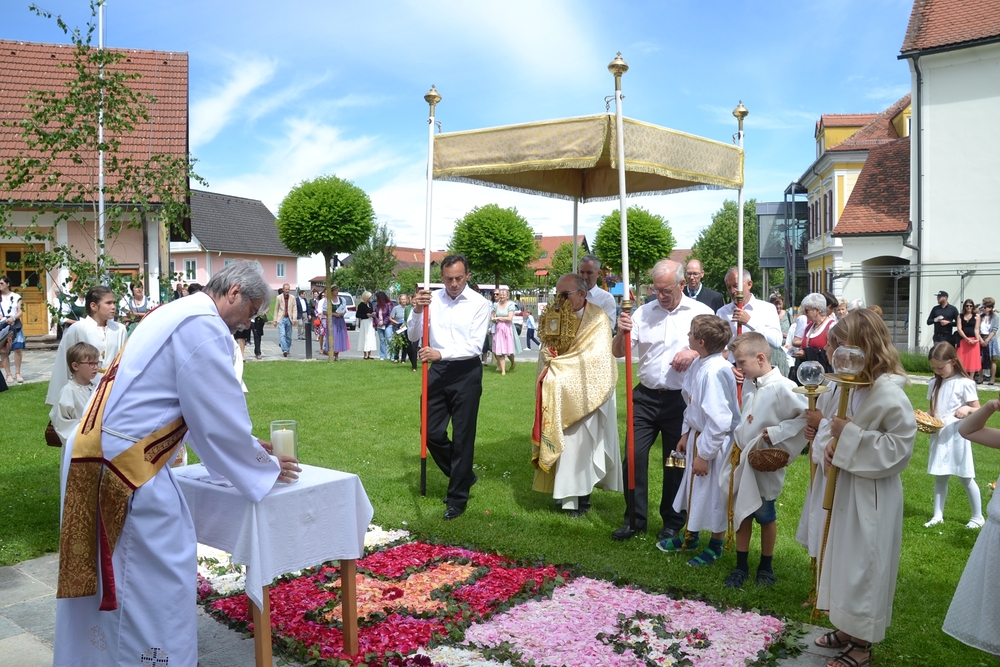 Mit Rosenkranzgebet und den Klängen der MUZ erreichte die Prozession schließlich den Kirchplatz, wo sich beim Altar vor dem Kreuz ein wunderschöner Blumenteppich befand, den die Minis am Vorabend mit großem Eifer gestaltet hatten. Diese „Augenweide“ wurde von vielen bewundert, auch von den mitfeiernden Gästen aus Wundschuh.