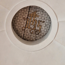 Die braunen Linien am unteren Teil der Kerze symbolisieren die Erde. Das Ostergeschehen wird für uns in der heiligen Messe auf besondere Weise gegenwärtig, deshalb reicht das Kreuz in die Gaben von Brot und Wein hinein, als Zeichen dafür, dass der auferstandene Jesus mit jedem von uns in Beziehung treten möchte und so das Licht der Auferstehung und Erlösung auch in unserem Leben zum Leuchten bringen möchte.