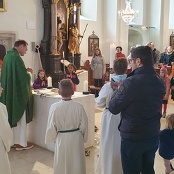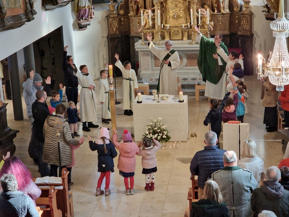 Zelebriert wurde die hl. Messe von Vikar Gerhard Hartmann und Diakon Michi Zepf, der die vielen Kinder zusammen mit den Minis zur Evangeliumsprozession und zum Vater-unser-Kreis einlud – spannende Momente für unsere Kleinen!