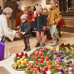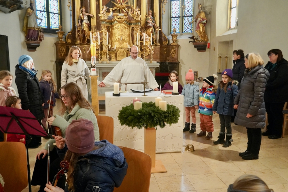 Erstmals durften in der Kirche auch die anwesenden Kinder die Adventkränze segnen, denn … „Segnen darf jede/r, dazu muss man nicht Priester oder Diakon sein!“ So lud Diakon Michi Zepf die Kinder dazu ein - und es machte ihnen sichtlich Freude!