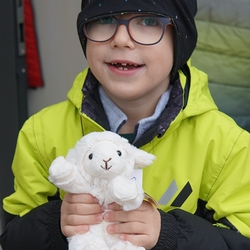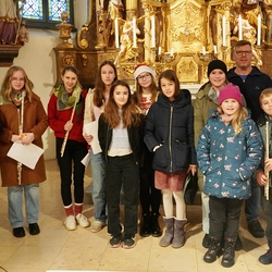 Zur besonderen Botschaft dieser heiligen Messe und zur besonderen musikalischen Gestaltung kam noch ein besonderes Danke-Sagen. Einige Minis bekamen für ihre treuen Mini-Dienste Auszeichnungen, die Anja Asel überreichte. Die drei neuen Minis,  Miriam, Victor und Maximilian, erhielten als „Antrittsgeschenk“ das Mini-Maskottchen Fridolin, ein kuscheliges Schäfchen.